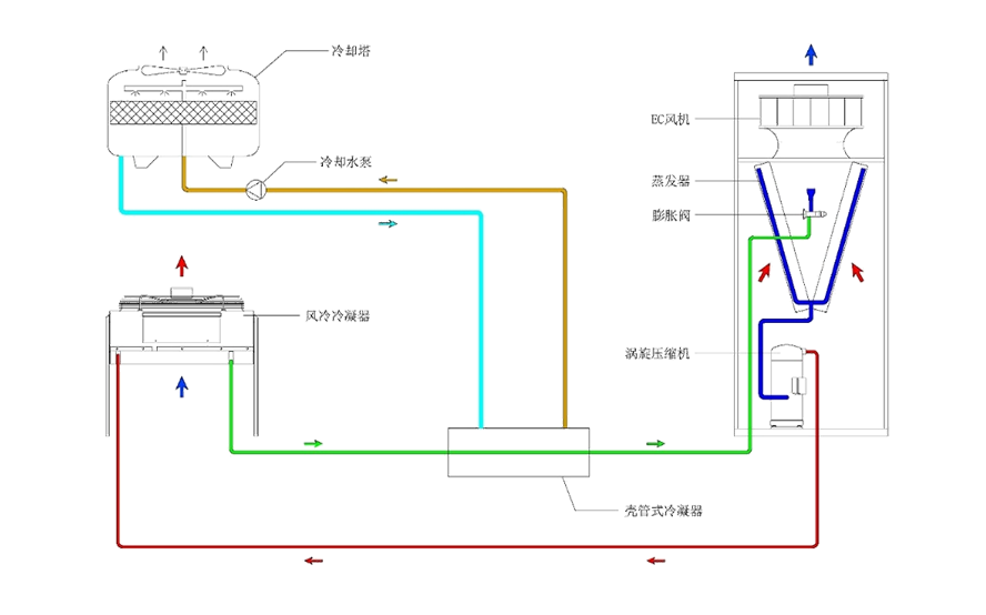 串聯(lián)分布式水冷換熱器,由冷卻塔代替風(fēng)冷冷凝器進(jìn)行排熱;工程預(yù)制化,換熱器、水泵、與控制系統(tǒng)集成;自適應(yīng)控制單系統(tǒng),安全性更高